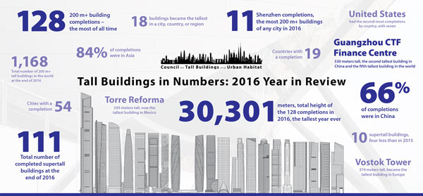 Dear Colleague, The Council on Tall Building and Urban Habitat (CTBUH) has released its annual review of tall building construction trends for 2016. The year was notable for having 128 buildings of 200 meters’ height or greater complete around the world – setting a new record for annual tall building completions. There were also eighteen 200-meter-plus buildings completed that became the tallest in a city, country, or region. Please find the full press release below. If you have any questions, please don’t hesitate to contact me. Download the Press Kit Visit the Interactive Data Page Best, Jason Gabel Communications Manager Council on Tall Buildings and Urban Habitat 中文版本 (View in Chinese) ![]() For Immediate Release 2016 Another Record-Breaker for Skyscraper Completions; 18 “Tallest Titles” Bestowed January 10, 2016 CHICAGO – The Council on Tall Buildings and Urban Habitat (CTBUH) has released its annual report, the 2016 Tall Building Year in Review, part of the Tall Buildings in Number data analysis series. Download the Full Report Here In 2016, 128 buildings of 200 meters’ height or greater were completed, setting a new record for annual tall building completions and marking the third consecutive record-breaking year. Key findings of the report include: